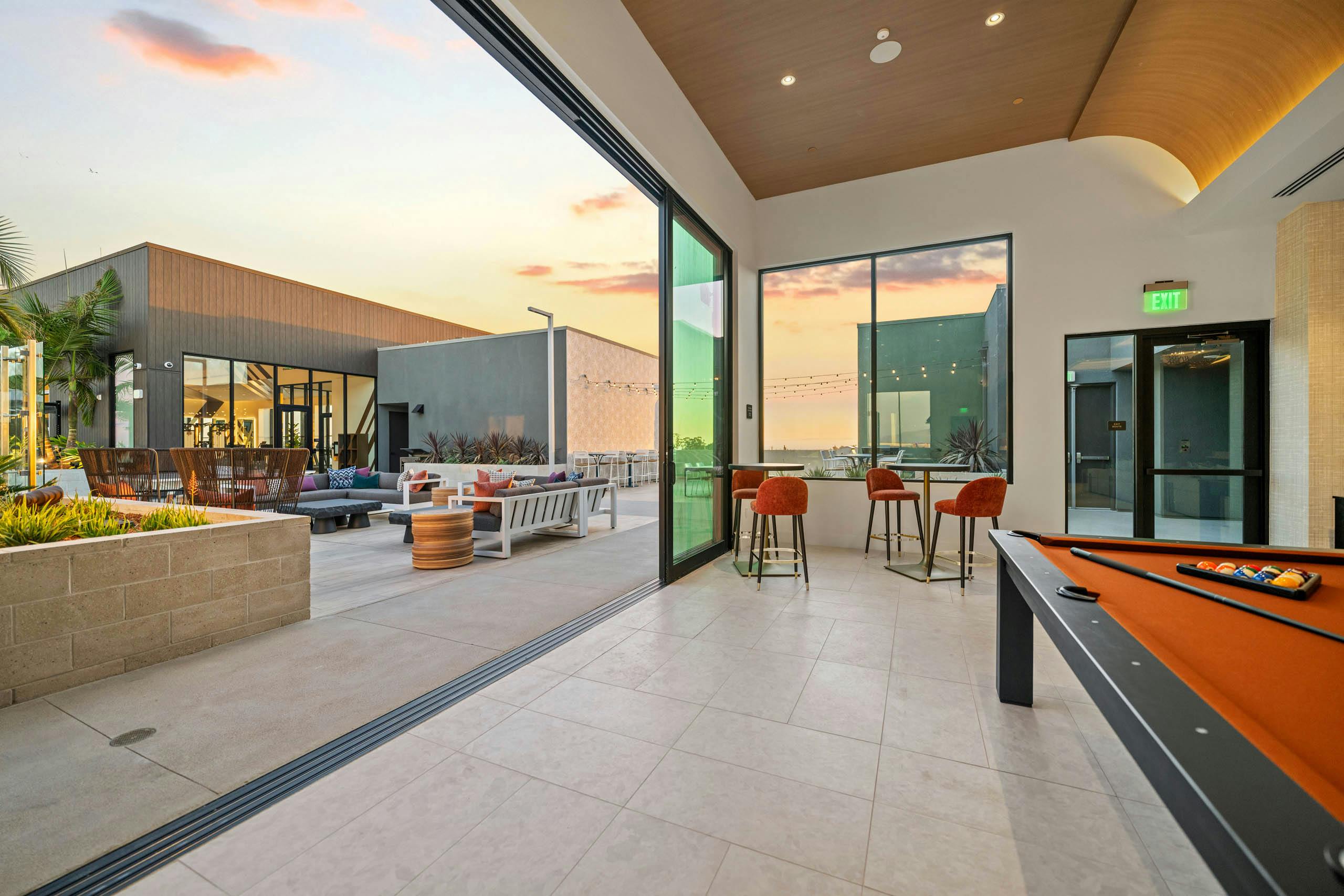 Our clubhouse and dining terrace is set up perfectly for social gatherings, private dinners, parties and entertainment of all kinds. Play a game of foosball, billiards or shuffleboard, or set up a board game next to the TV. A large kitchen space makes it easy to host game-day events or parties, as is the outdoor grill space with large counters, abundant seating and views of the city and mountains beyond.