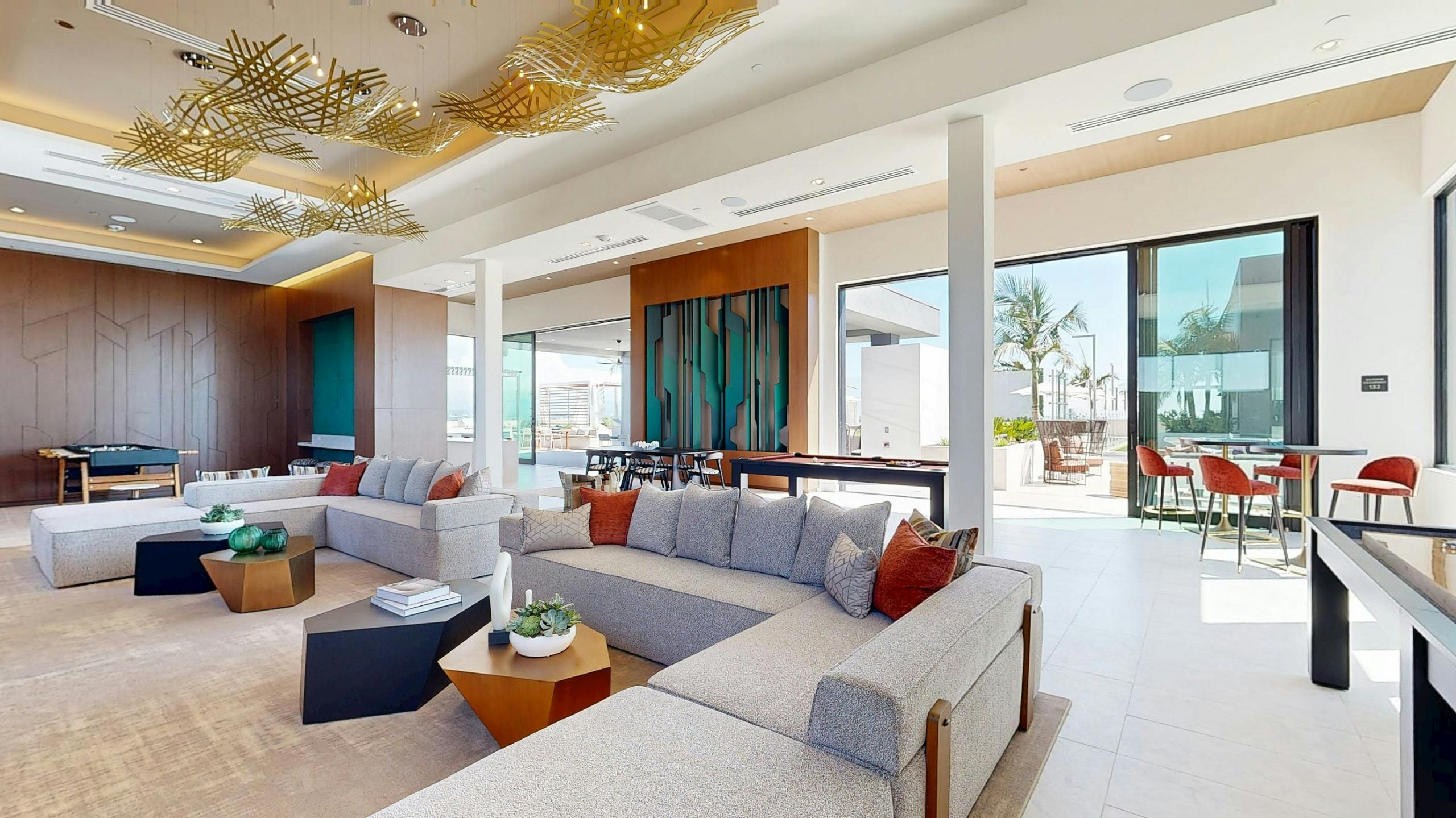 It’s easy to host gatherings here, especially since the terrace is directly beside both the rooftop pool, the outdoor fire pits, the shady cabanas and the fitness center!