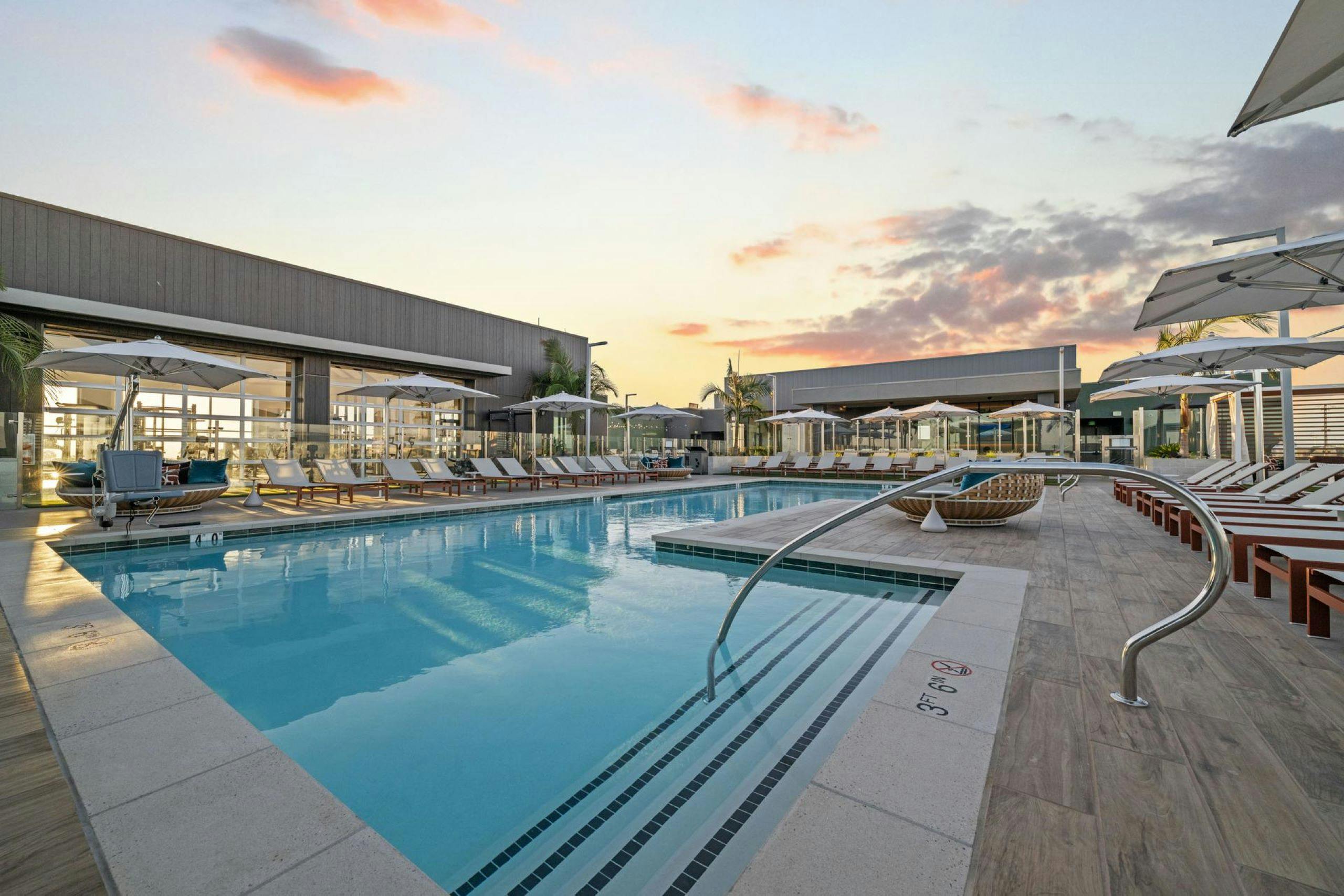 Our rooftop pool is sleek, sexy and super lounge-able, with shaded seating and private cabanas and panoramic views. Cozy up to a firepit after a swim, or take in the sunset views over San Diego.